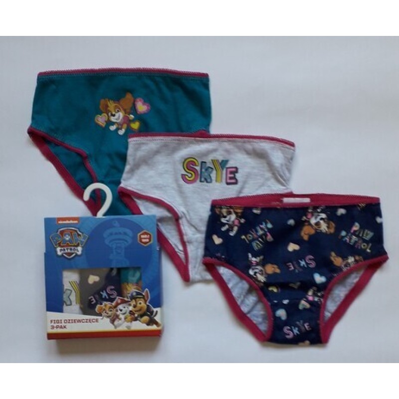 Комплект от 3 чифта гащички за момичета от 2 до 7 години. Гащичките са различни цветове, изработени от качествен памук, със сполучлива кройка, гарантираща удобство при носенето. Бикините са оригинален лицензиран продукт Paw Patrol Nickelodeon и са със смелото кученце Скай от Пес Патрул.
