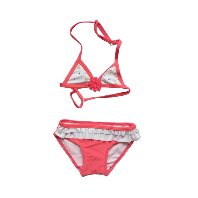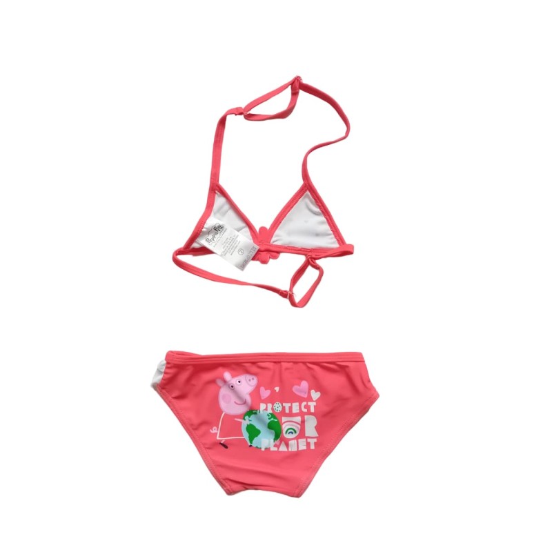 Стилен бански костюм от две части за почитателки на Прасенцето Пепа в два цвята. Долната част е с нежни бели къдрички и картинка на Пепа отзад, както и надпис Protect Our Planet. Горнището е с триъгълници, с интересно цветенце отпред и практична система за регулиране.