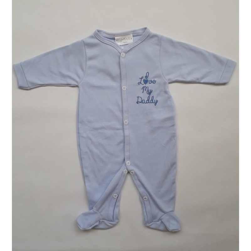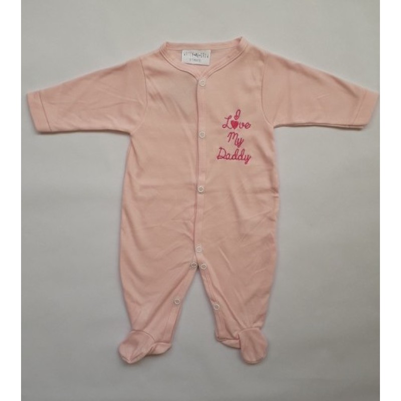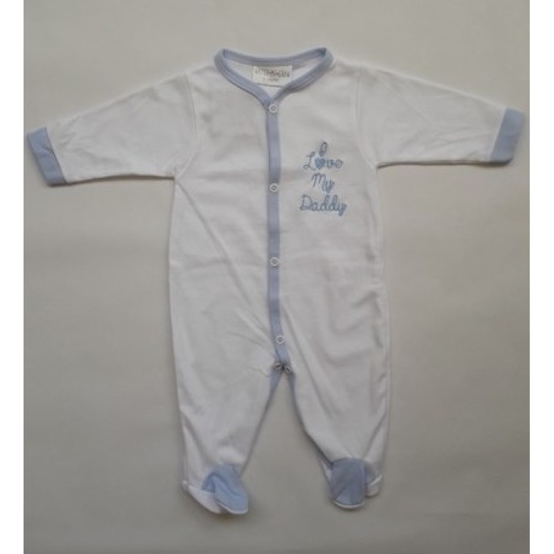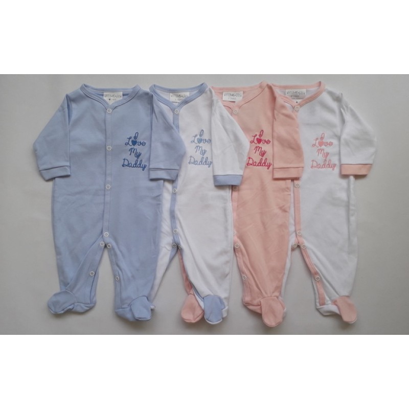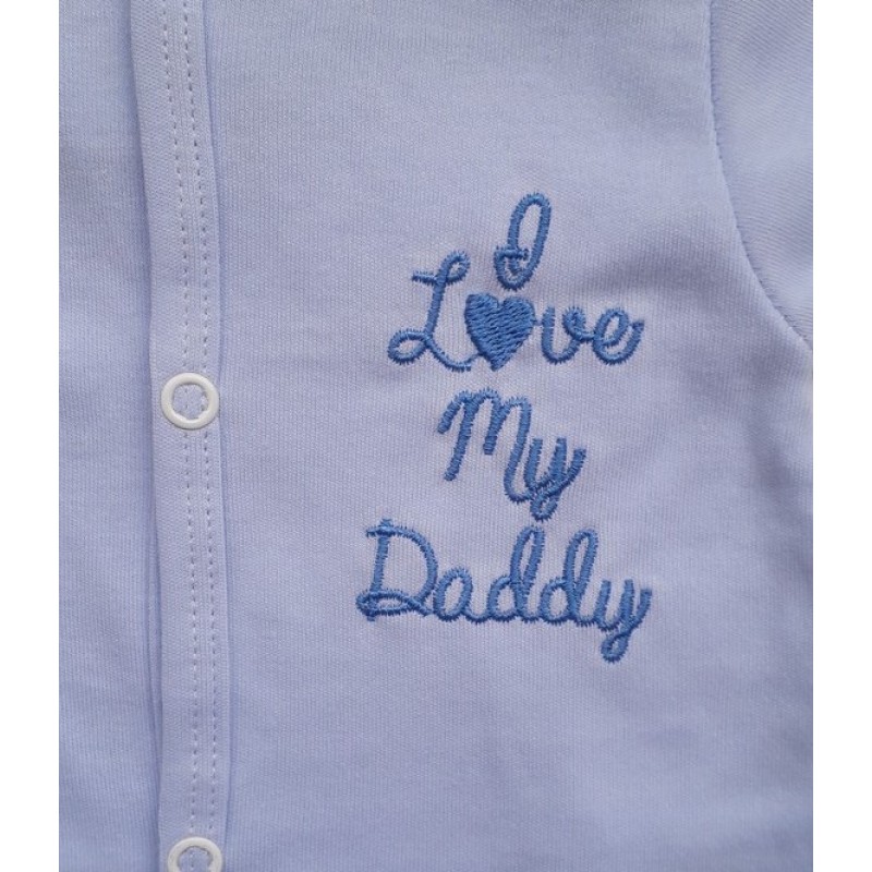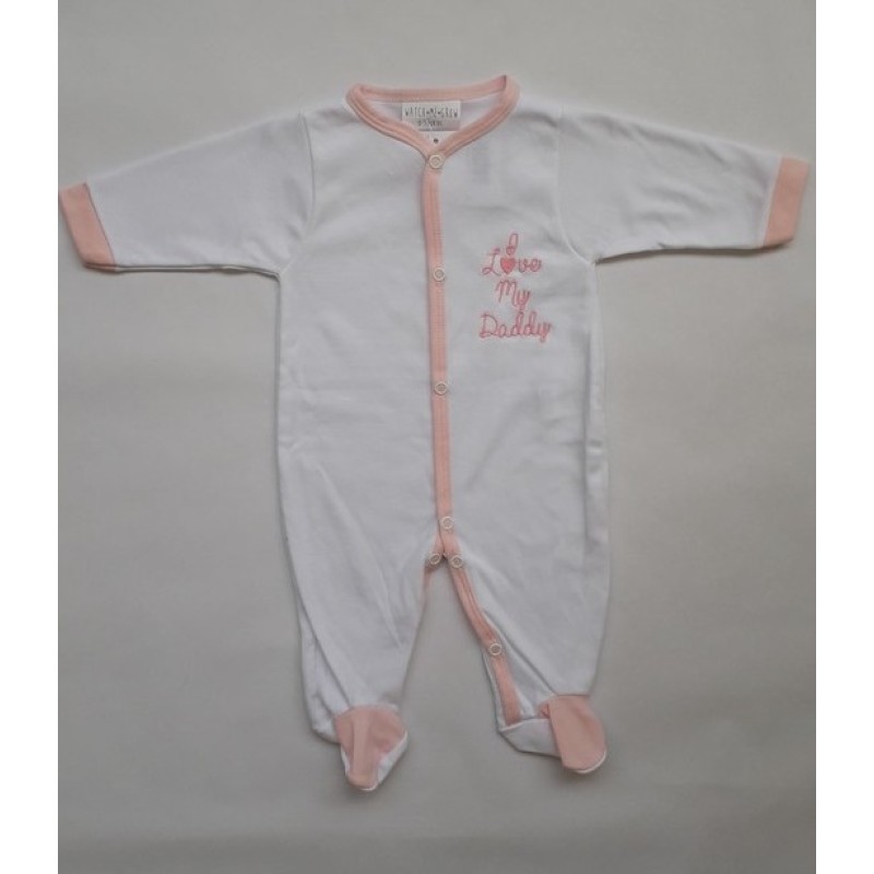 Изчистен гащеризон за бебе от фина памучна материя в четири варианта : розов, син, бял с розово и бял със синьо. Гащеризонът е с дълго ръкавче, затворен на крачетата, с надпис I Love My Daddy.