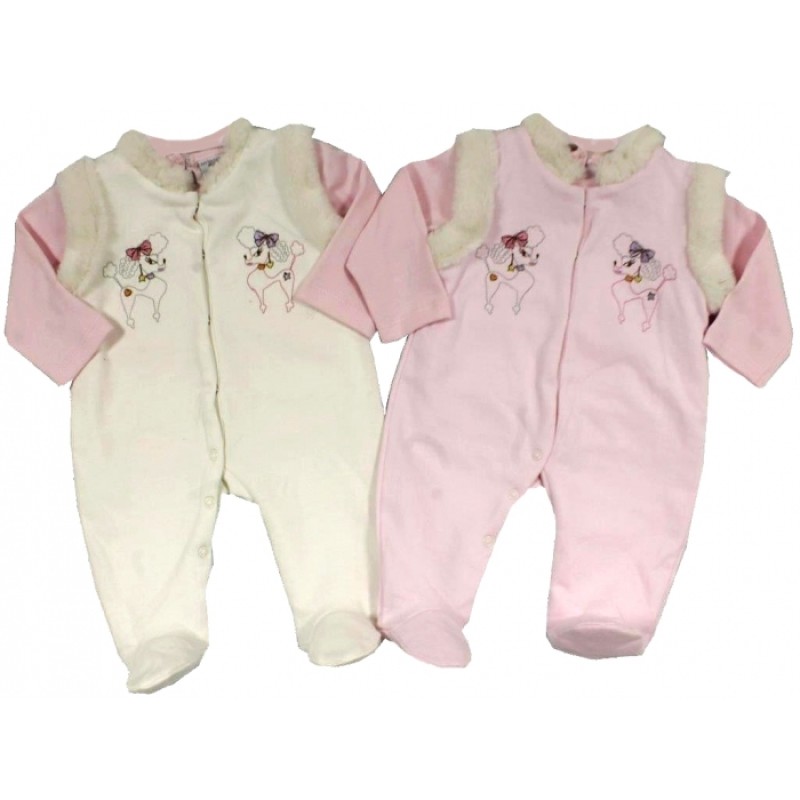 Невероятно бебешко комплектче от мека плътна памучна материя. Гащеризонът е с пухчета и бродерия, с копчета тик-так отпред и по едното краче. Блузката е с дълъг ръкав с копче отзад за по-лесно обличане. Предлага се в два варианта: Розов гащеризон и блузка и Бял гащеризон с розова блузка.