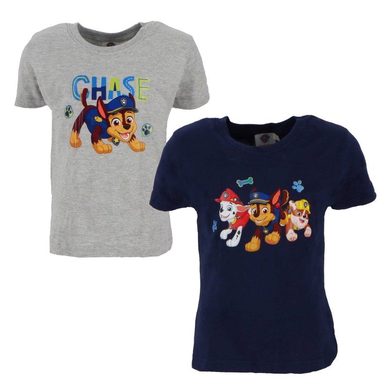 За почитателите на детски дрехи с кученцата от Пес Патрул - комплект от 2 броя блузи с къс ръкав за момчета. Сива - с Чейс и тъмносиня - с Чейс, Маршал и Рабъл.