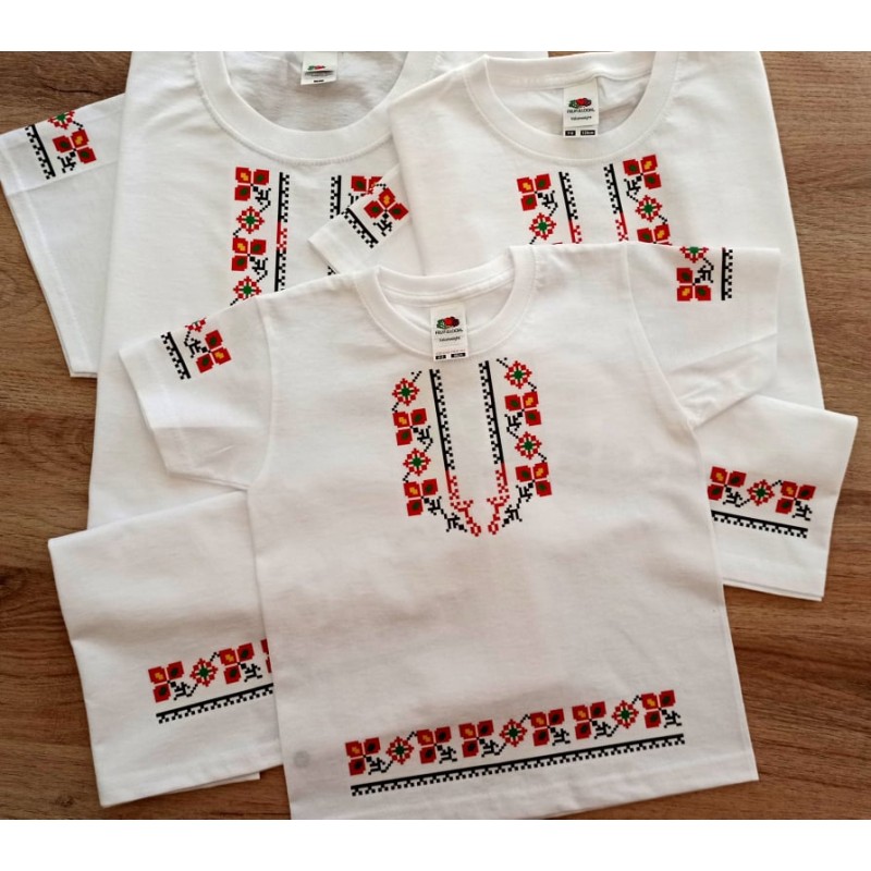 Ефектни блузи с щампа шевици с народни мотиви. Комплект от 3 бр. Моделът за дамската е с леко вталена кройка.