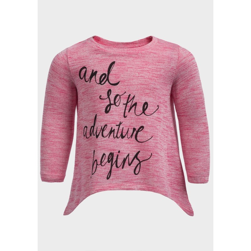 Кокетна трикотажна блуза с дълъг ръкав за момиченца в розов меланж със стилна нестандартна кройка с А-силует и оригинален надпис на гърдите.