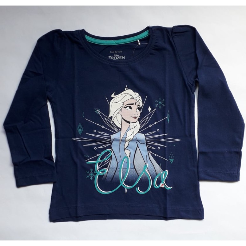 Стилна блуза с дълъг ръкав за момиче в изискан тъмносин цвят, с изображение на красивата Елза от Замръзналото кралство. Блузата е от тънък памучен плат, подходяща за ежедневието, детската градина, училището, в съчетание с дънки за спортна визия, а защо не и за по-официални случаи?