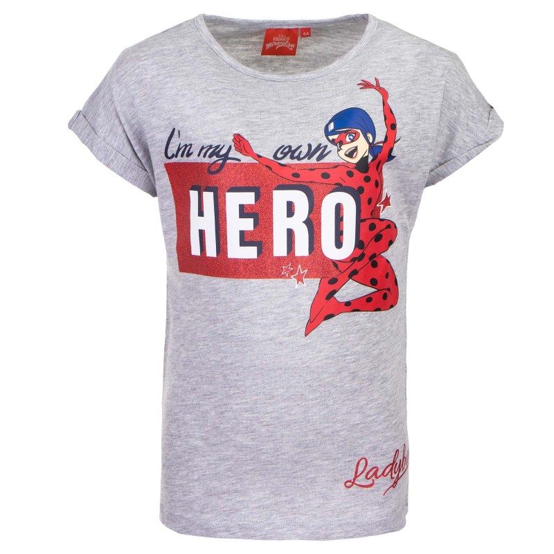 Много качествена блуза с къс ръкав за момиче в приятен сив меланж, посветена на любимата героиня Калинката. Блузата е с нежно бие, подгъви на ръкавите, надпис I'm My Own HERO и разбира се, изображение на Калинката.