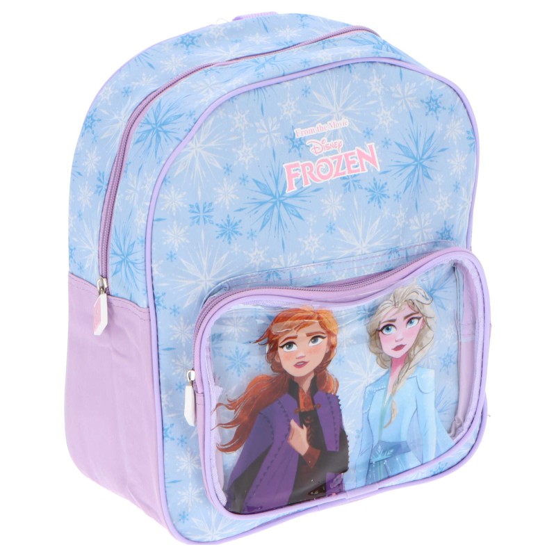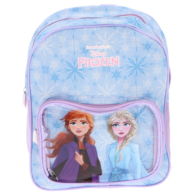 Чудесна раница, идеална за момичета, почитателки на принцесите Елза и Анна. Дизайнът е вдъхновен от зимната приказка Леденото кралство и включва образите на двете сестри, заобиколени от снежинки и ледени мотиви. Раницата е с едно голямо отделение, а джобът с цип осигурява допълнително пространство за по-малки предмети.