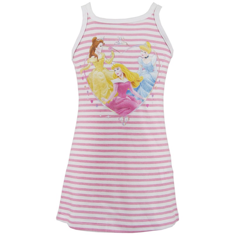 Семпла лятна детска рокля с презрамки от лека памучна материя, осигуряваща комфорт в жегите. Детската рокля ще се понрави на всяко момиченце, което харесва дрехи с Дисни принцесите, тъй като отпред на гърдите има щампа на стилизирано сърце и три от принцесите.