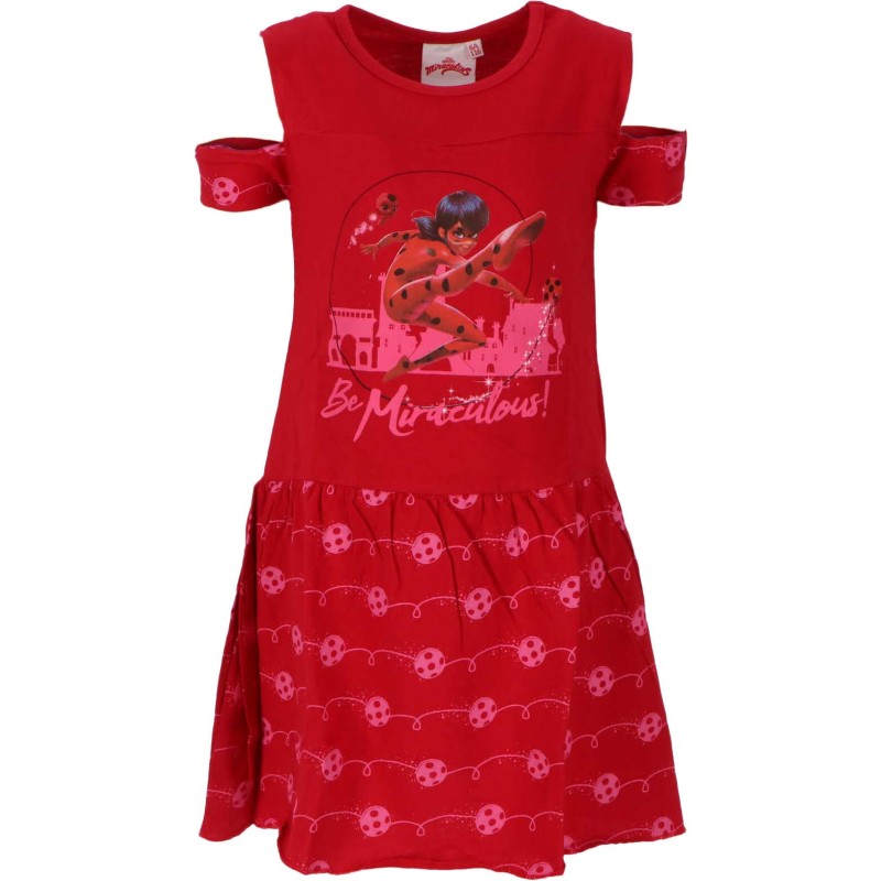 Семпла, но изключително елегантна детска рокля за момиче в характерния за Калинката червен цвят. Роклята е с изискан леко разкроен силует и голи рамене, като отпред има изображение на Калинката и надпис Be Miraculous. Това е дреха, с която всяко малко момиче, фен на Калинката, ще впечатли и очарова.