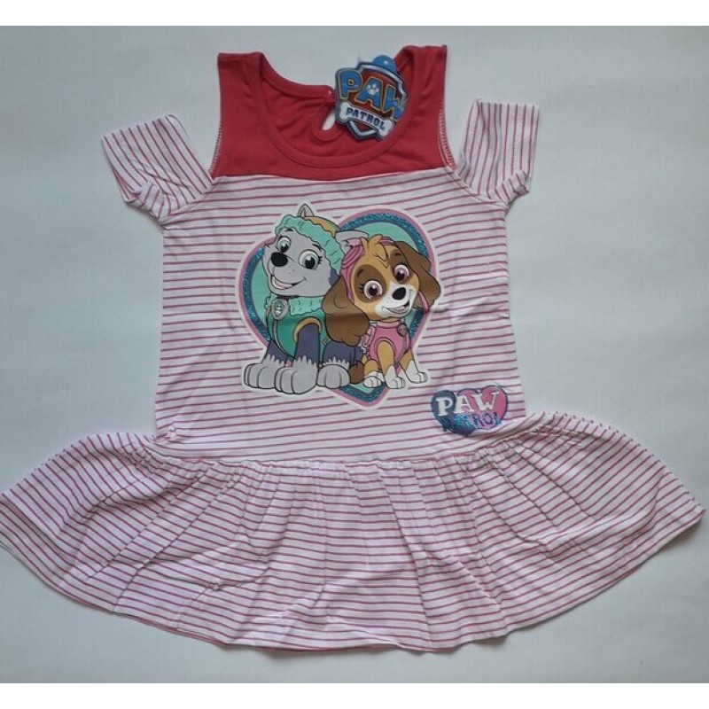 Детска рокля за момиче от висококачествена памучна материя с любимите героини Скай и Еверест от детската поредица Пес Патрул. Роклята е в любимите момичешки цветове розово и бяло, с интересно паднало ръкавче и голи рамене. Малките почитателки на Пес Патрул биха могли да я обличат при всякакви случаи в летните жеги - материята и кройката ще осигурят комфорта и на най-претенциозните.