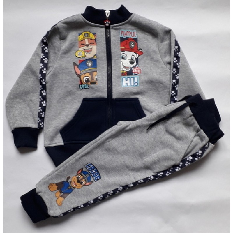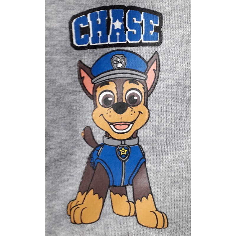 Интересен детски комплект за момче за сериозни фенове на Пес Патрул. Екипът е основно в сив цвят, като ластиците и джобовете са в тъмносиньо. Долнището има и връзки, за по-голямо удобство при носенето, а на левия крачол е изобразен Чейс - кученцето-полицай в детската поредица. Горнището е тип суичър с цип и джобове-кенгуру и щампа на Чейс, Маршал и Рабъл. Ансамбълът се завършва от черен кант с лапички на долнището и ръкавите. Екипът за момче с кученца е идеална спортна екипировка за по-хладните дни за всяко момченце, което харесва детски дрехи с героите от Пес Патрул.