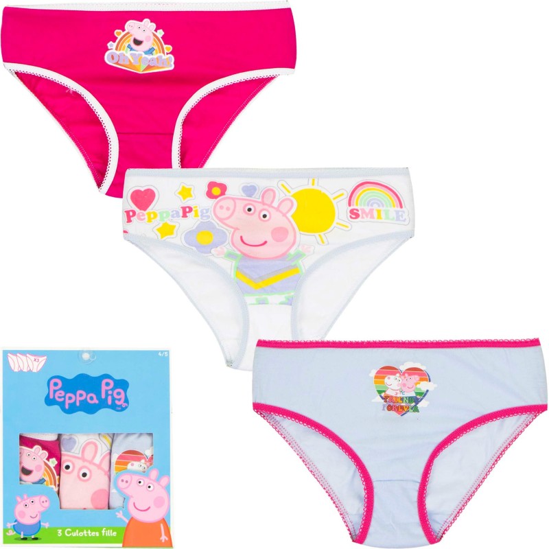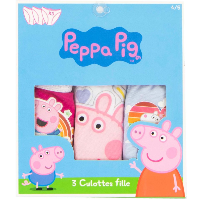 Комплект от 3 бр. памучни гащички за момиче с Прасенцето Пепа. Гащичките са ефектни и удобни, чудесен сет бельо за момиченцата, които харесват дрехи с Пепа. В раздел Детски дрехи с Прасенцето Пепа ще намерите още предложения за момичета с палавата анимационна героиня.