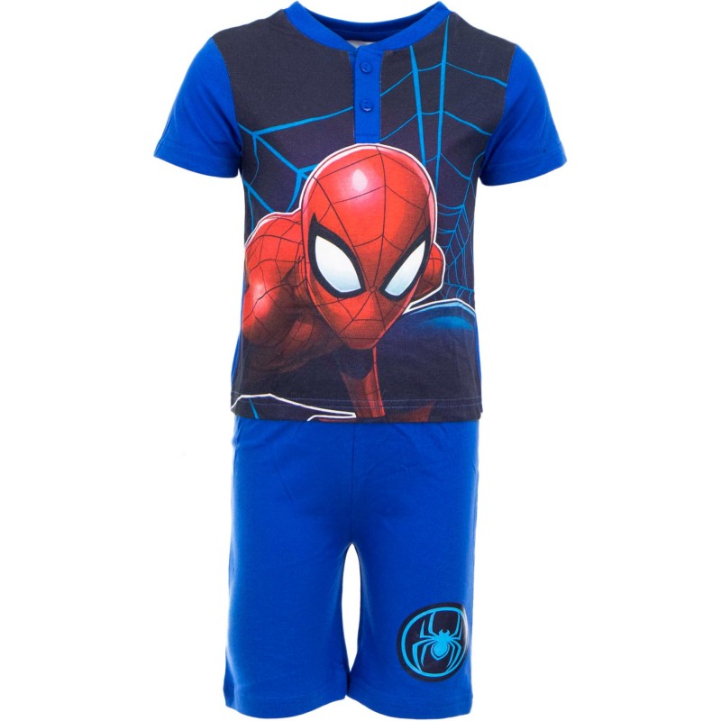 Стилна лятна пижама за момче с къс ръкав и крачол. Горната част на пижамата представлява блузка с изображение на Спайдърмен отпред и копченца на деколтето. Долната част са панталонки в приятен син цвят с емблемата на Спайдърмен на левия крачол.