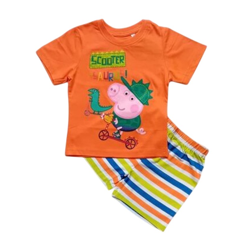 Прасенцето Джордж с любимия му динозавър! Чудесна лятна пижама за момчетата, любители на детската анимация за Прасенцето Пепа и семейството й. Удобна памучна пижама за момче с къс ръкав и крачол в свежи летни цветове, в която момчето ти ще се влюби.
