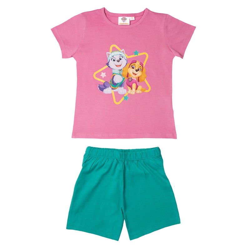 Детска лятна пижама за момиче от качествена памучна материя. Пижамата е с къс ръкав и крачол, с блузка в сладко розово и картинка на усмихнатите Скай и Еверест от Пес Патрул. Долната част също е едноцветна, но в светлозелено.