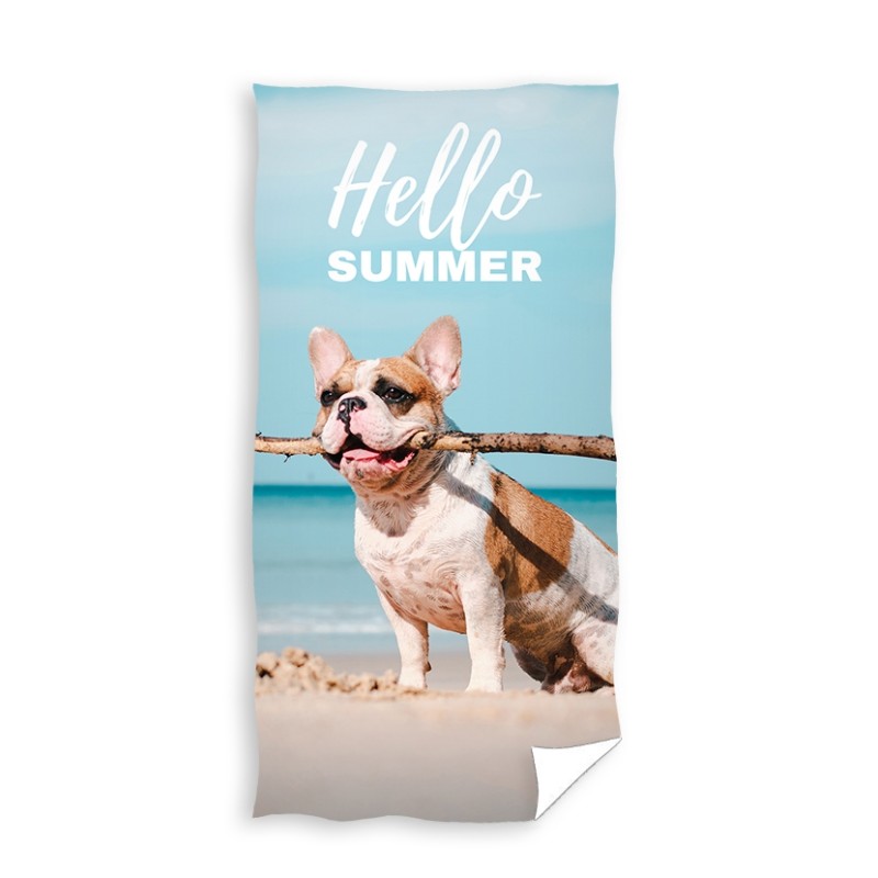 Чудесна детска хавлия за плаж или баня със сладко кученце и надпис Hello Summer. Кърпата е със станд..
