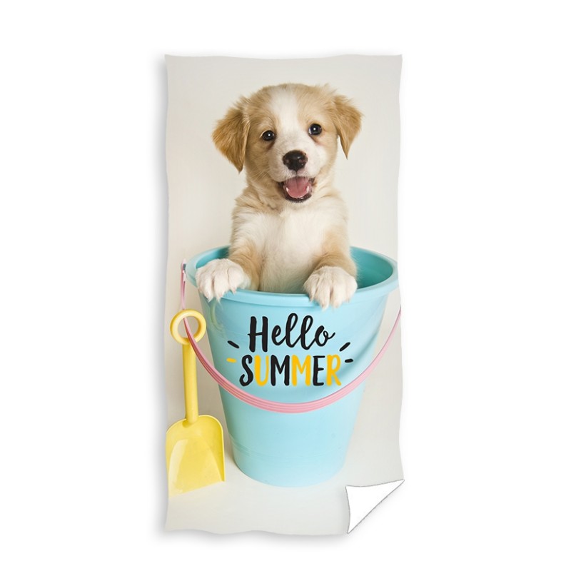 Чудесна детска хавлия за плаж или баня със сладко кученце и надпис Hello Summer. Кърпата е със стандартни размери 70х140см, подходяща както за момчета, така и за момичета, любители на животинки.