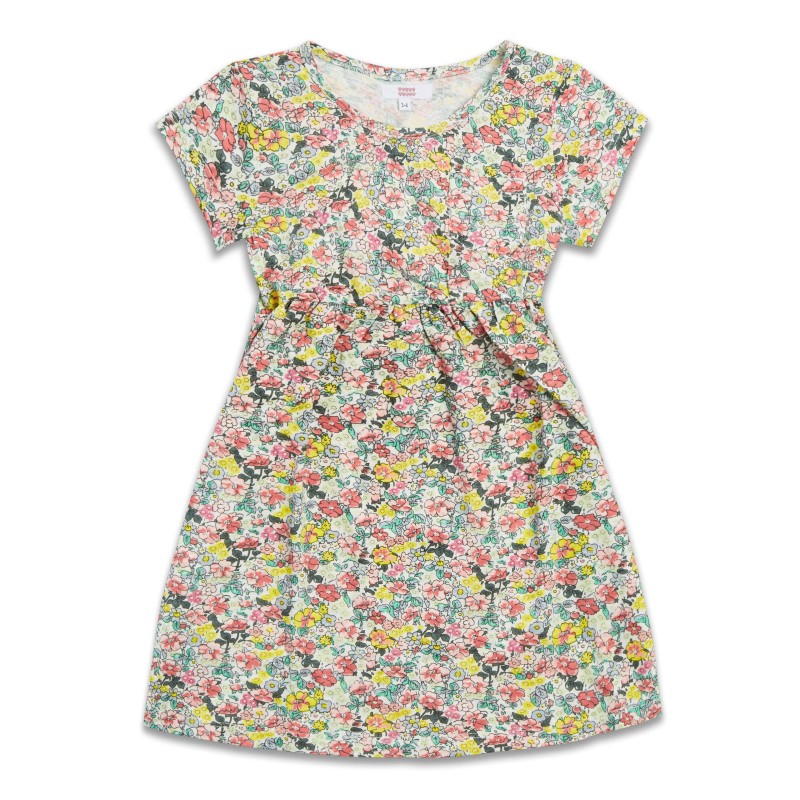 Изключително свежа лека лятна рокля за момиченцето ви. Роклята е с късо ръкавче, леко разкроена, с пъстър принт на дребни цветенца.