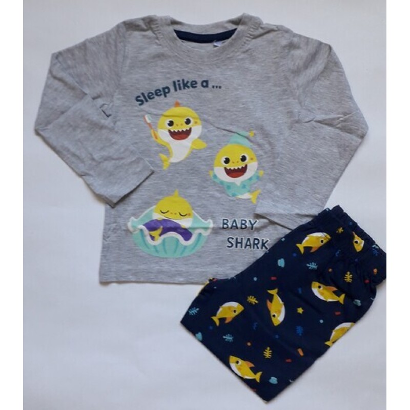 Детската анимационна поредица Малката акула набира все по-голяма популярност сред децата и те често желаят да видят героите й върху дрехите си. Тази пижама с дълъг ръкав и крачол е много подходяща, за да изпълните това желание. Детската пижама е от две части - синьо долнище с принт рибки и сиво горнище с изображение на Малката акула, която се приготвя за сън и надпис Sleep like a... Baby Shark.