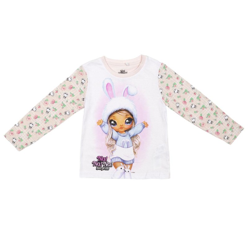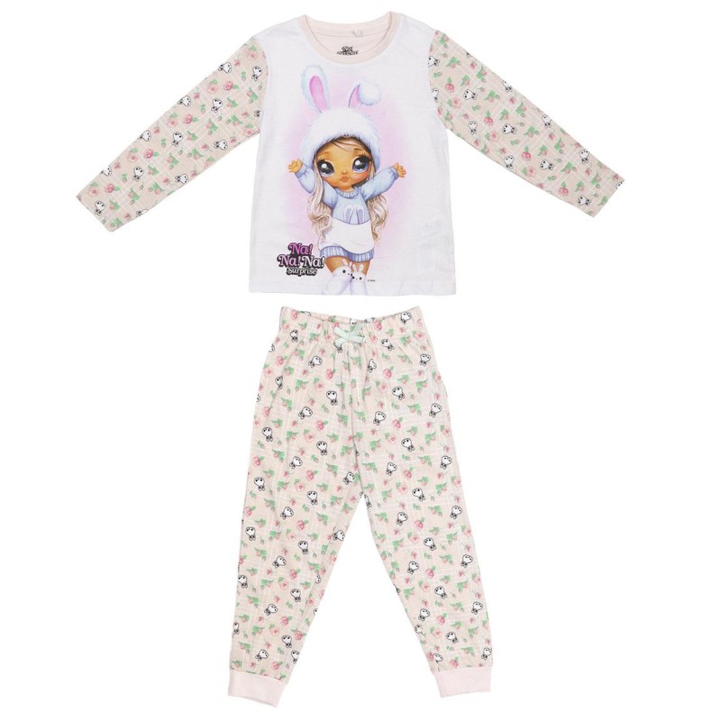 Много, много сладка пижама за момиче от две части с дълъг ръкав и крачол. Горната част е с изображение на любимата кукла и надпис Na! Na! Na! Surprise, а ръкавите, както и долнището, са изпъстрени с щампа на зайчета и цветя. Пижамата е от мека памучна материя - удобна и практична.