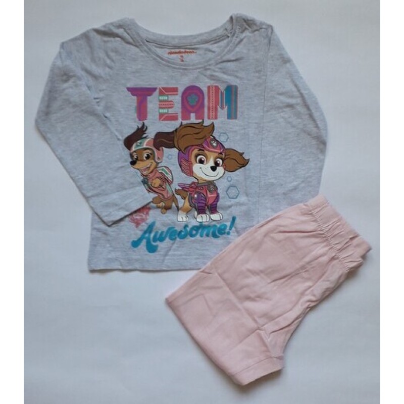 Сладка детска пижама от две части за малки почитателки на Пес Патрул. Горната част е в нежен меланж с щампа на Скай и Либърти и надпис Team Awsome, а долната - в едноцветно розово. Меката памучна материя е особено подходяща за нежната детска кожа и гарантира спокоен сън на детето.