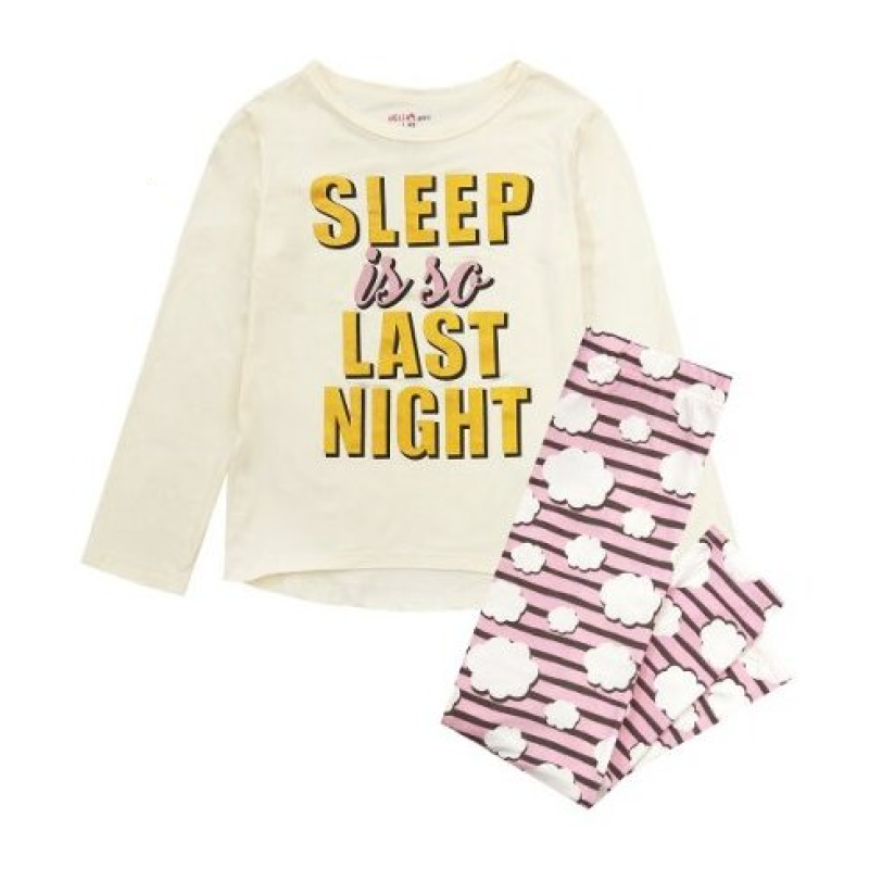 Кокетна пижама за момиченца с вкус и усет към красивото. Пижамата е с едноцветна горна част с надпис Sleep Is So Last Night в жълто и розово и готино долнище с облачета.