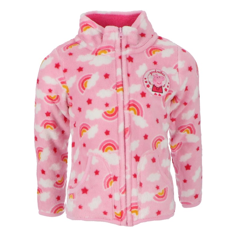 Мекичък поларен суичер за момиченца със слабост към детските дрехи с Прасенцето Пепа. Поларът е идеален вариант за връхна дреха за преходните сезони, подходящ за спорт и игра, за детската градина или разходка. Закопчаването е удобно - с цип, има си и две джобчета за най-необходимото, а десенът - облачета и дъгички, със сигурност ще се хареса на всяко момиченце.