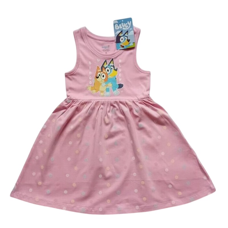 Безспорните любимци на момчета и момичета, а и на техните родители - Бинго и Блуи - са основният акцент в тази лятна детска рокля. Изображението на кученцата е отпред на гърдите, а полата е леко разкроена, обсипана със закачливи точици в свежи пастелни цветове.