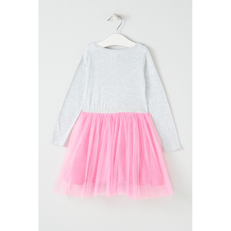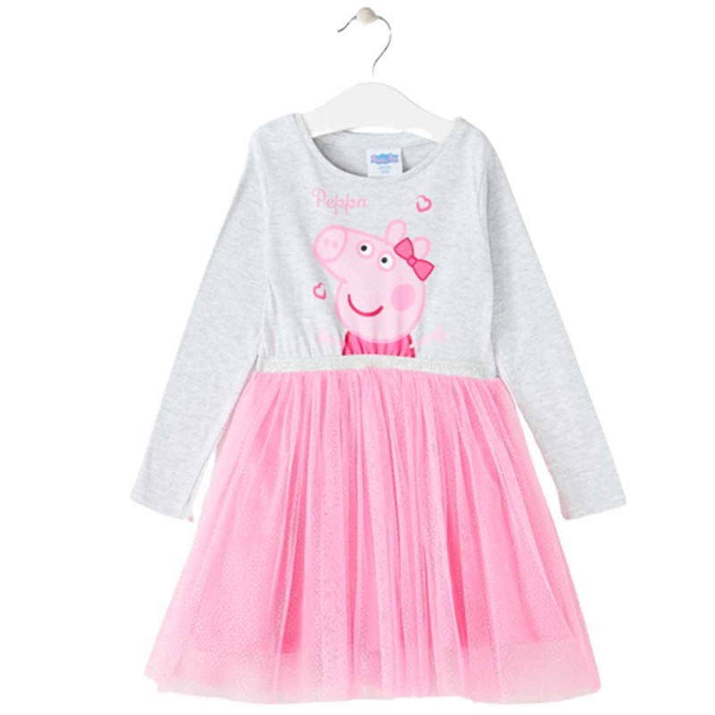 Красива детска рокля с дълъг ръкав в любимото на момичетата розово в комбинация със светлосива горна част. Най-важният елемент, разбира се, е изображението на Прасенцето Пепа, но не бива да подценяваме и полата от тюл - също особено предпочитан от малките госпожици компонент на детската рокля. Дългите ръкави и качествената памучна материя (98/2% памук/полиестер) на горната част пък са нещата, които със сигурност ще се харесат на майките. Изобщо - детска рокля-мечта, подходяща както за ежедневието, така и за по-специални събития.