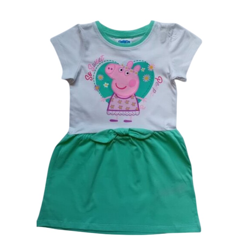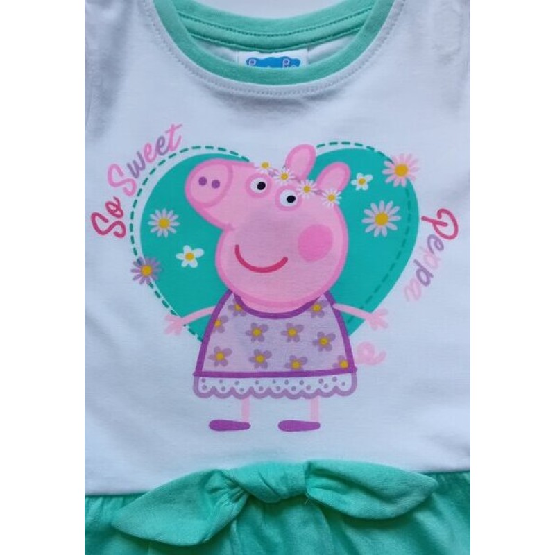 Свеж летен модел детска рокля извън стандарта от класическо розово за момичета, но в приятен светлозелен цвят, който със сигурност ще допадне на не една и две почитателки на Прасенцето Пепа.
