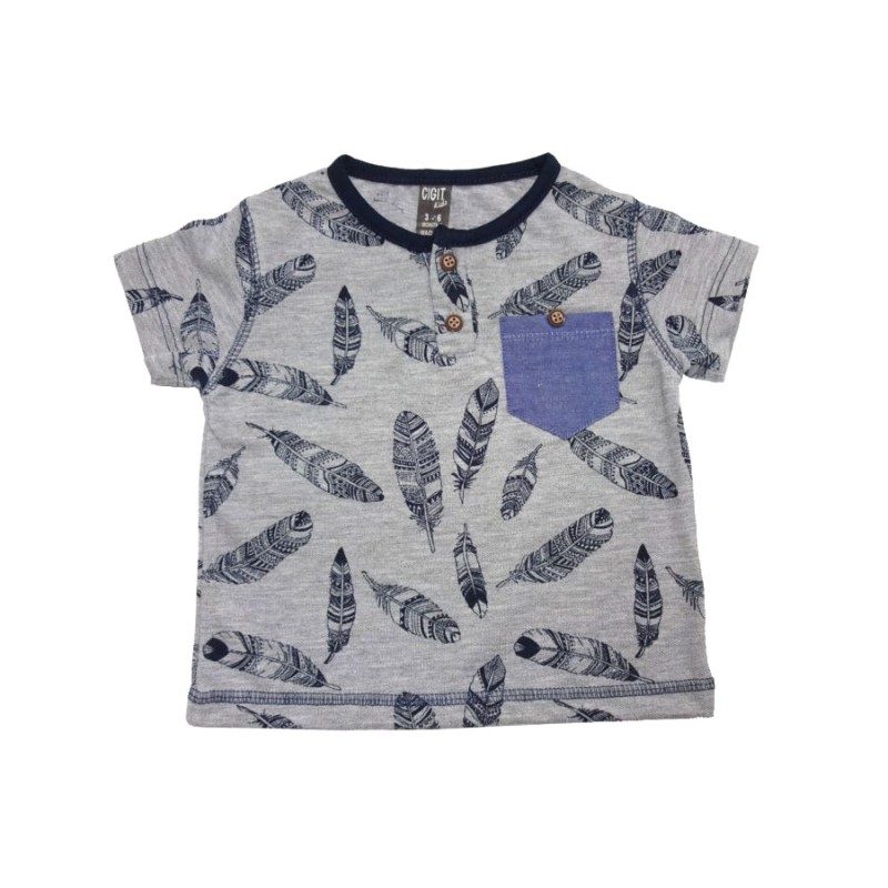 Сива тениска със синьо джобче Палмови листа