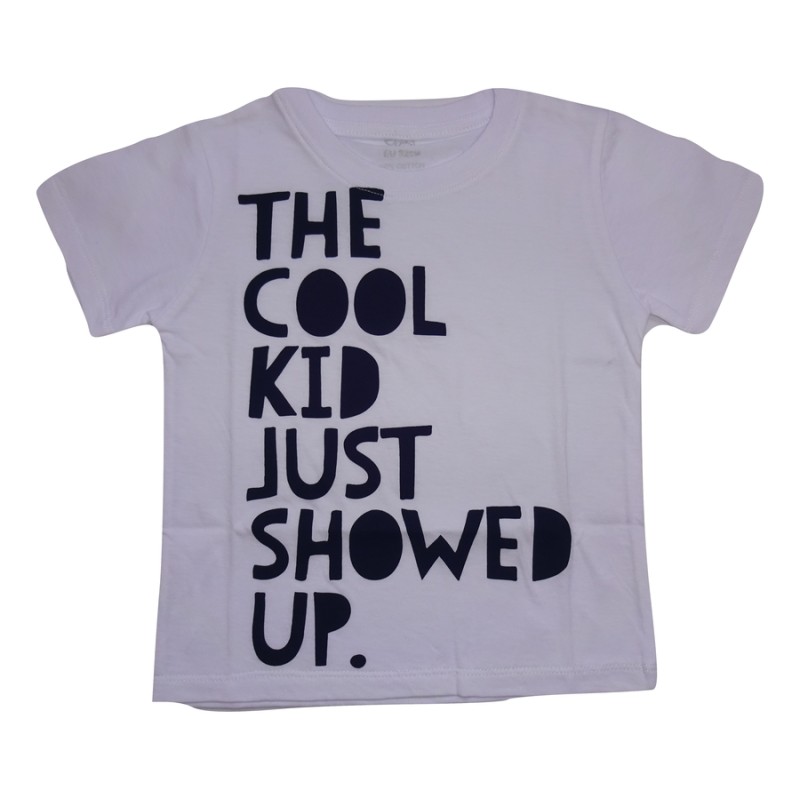 Много стилна бяла блузка с къс ръкав за момчета. Блузата е изработена от висококачествена памучна материя, със закачлив надпис на гърдите The Cool Kid Just Showed Up.