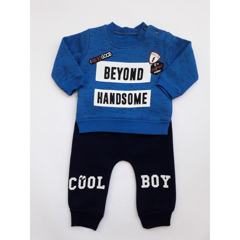 Много симпатичен ватиран комплект за момче от две части - блузка и панталон. Блузата е в приятен син цвят с имитация на меланж и надпис на гърдите Beyond Handsome. Закопчава се с копченца на рамото. Долнището е тип потур с ненатрапчиви надписи на двата крачола. Бебешкият екип е изработен от качествена памучна материя - мек и топъл.