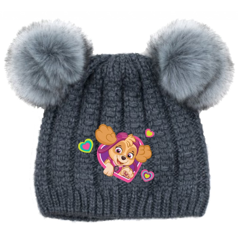 Уникално сладка детска зимна шапка за момиче с уникално сладката Скай от Пес Патрул. Шапката е в универсален сив цвят, удобна за комбиниране с всякакви дрехи. Декорирана е с така модерните напоследък две пухчета, а отпред има апликация на Скай със сърчица. Шапката е семпла, но стилна и със сигурност ще се хареса на всяка малка почитателка на Пес Патрул.